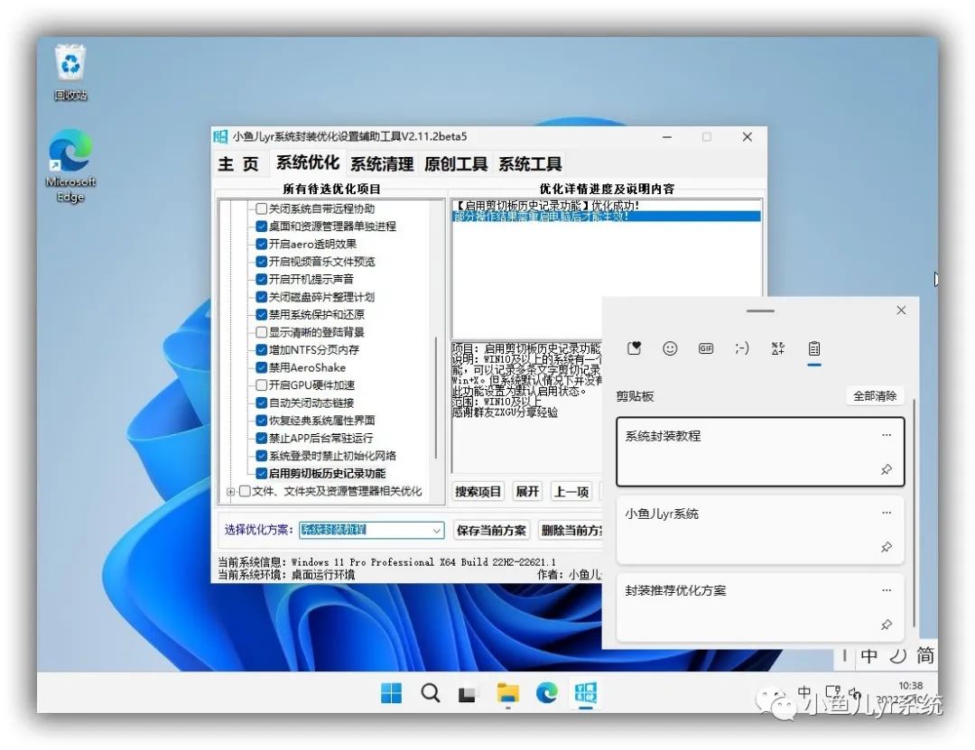 3.【系统优化】增加【启用剪切板历史记录功能】。(感谢群友ZXGU提供经验)WIN10及以上的系统有一个方便好用的剪切板历史记录功能,可以记录多条文字剪切记录,查看剪切板历史记录的快捷是Win+X。但系统默认情况下并没有启用这个功能,此项优化可以将此功能设置为默认启用状态。