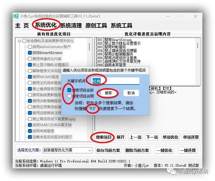 4.增加【搜索项目】功能,目前暂时只支持搜索优化项目名称或优化说明内容中包含的关键字或词进行快速搜索定位。其实之前有很多朋友给我提过这个建议,一直没在意,因为有点忙(lan),一直没增加这个搜索功能,直到前些天,我自己想要优化一个项目,只知道关键字,但是找半天没找到,一气之下把这个功能开发出来。支持搜索项目的名称或者项目的说明里包含的关键字。输入关键字搜索后可以直接按F3可以快速循环搜索所有包含关键字的优化项目。