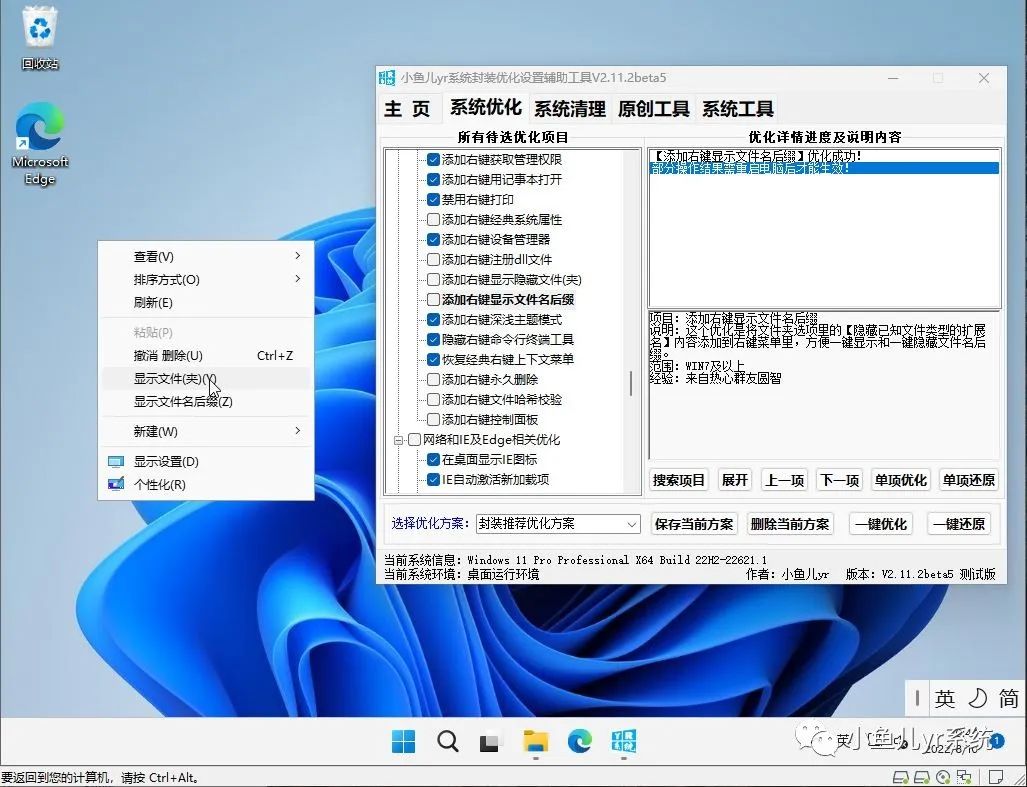 8.【系统优化】将【右键显示隐藏文件及后缀】拆分成【右键显示隐藏文件(夹)】和【右键显示文件后缀】两个单独的优化项目。(感谢群友泡泡体验反馈)在泡泡建议之前,其实已经有好几个网友建议将这个项目分开优化。