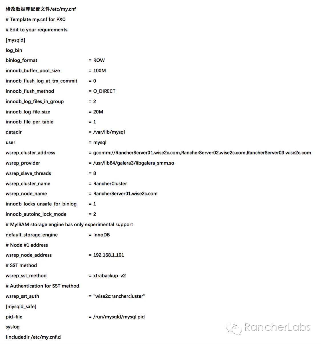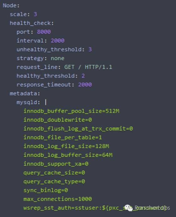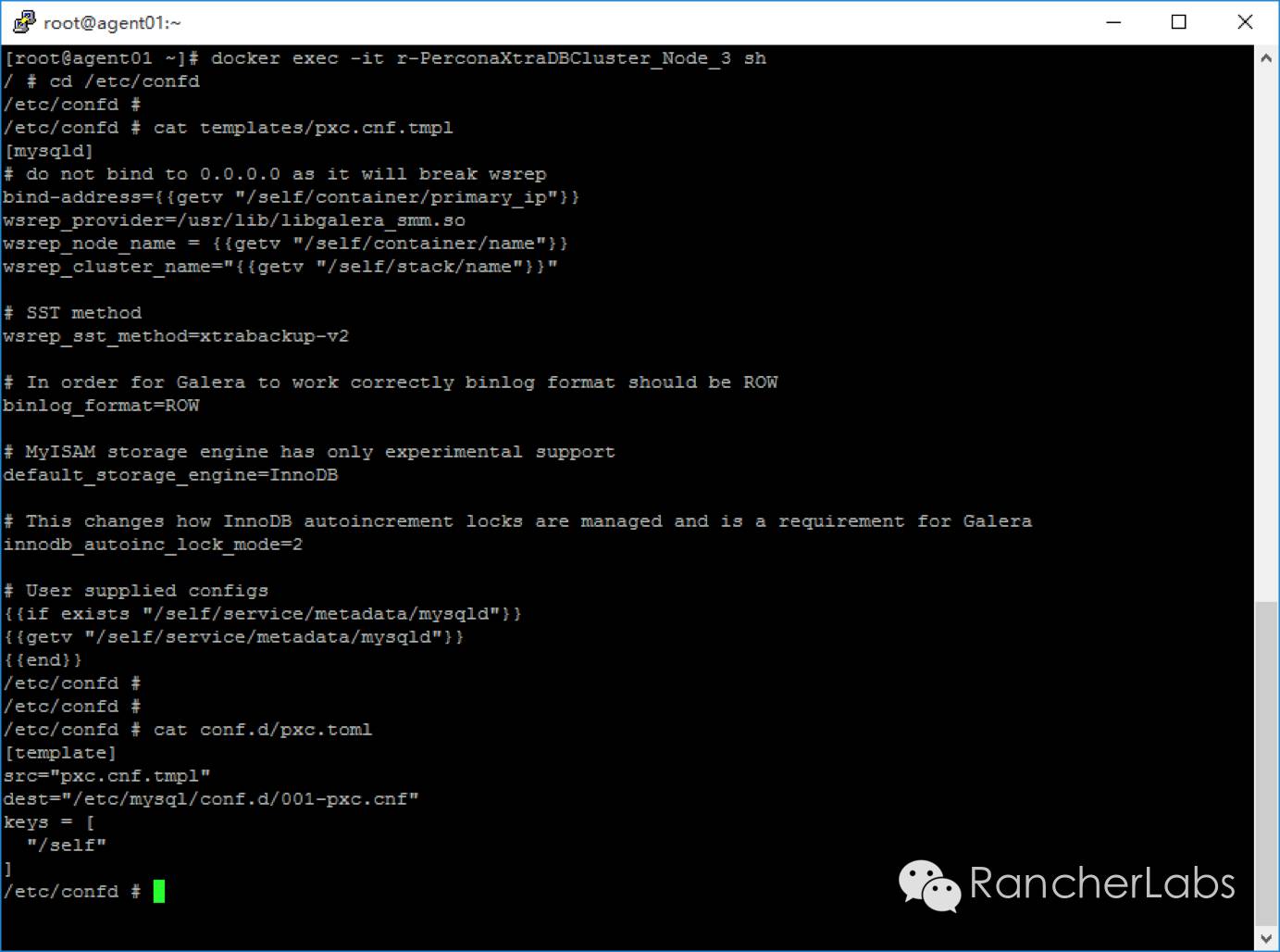 这里的pxc.cnf.tmpl文件是模板文件,而pxc.toml文件则是配置文件。confd的配置文件是建立一个服务,监控特定的backends对象(例如etcd、rancher元数据等等)的键值以及当值发生变化时执行某些操作。其文件格式是TOML,易于使用,其规则跟人的直觉也相近。我们可以看到容器执行期间,Rancher预先在rancher-compose.yml中定义的metadata元数据通过confd将一些重要参数传递给了数据库集群服务的配置文件my.cnf:
