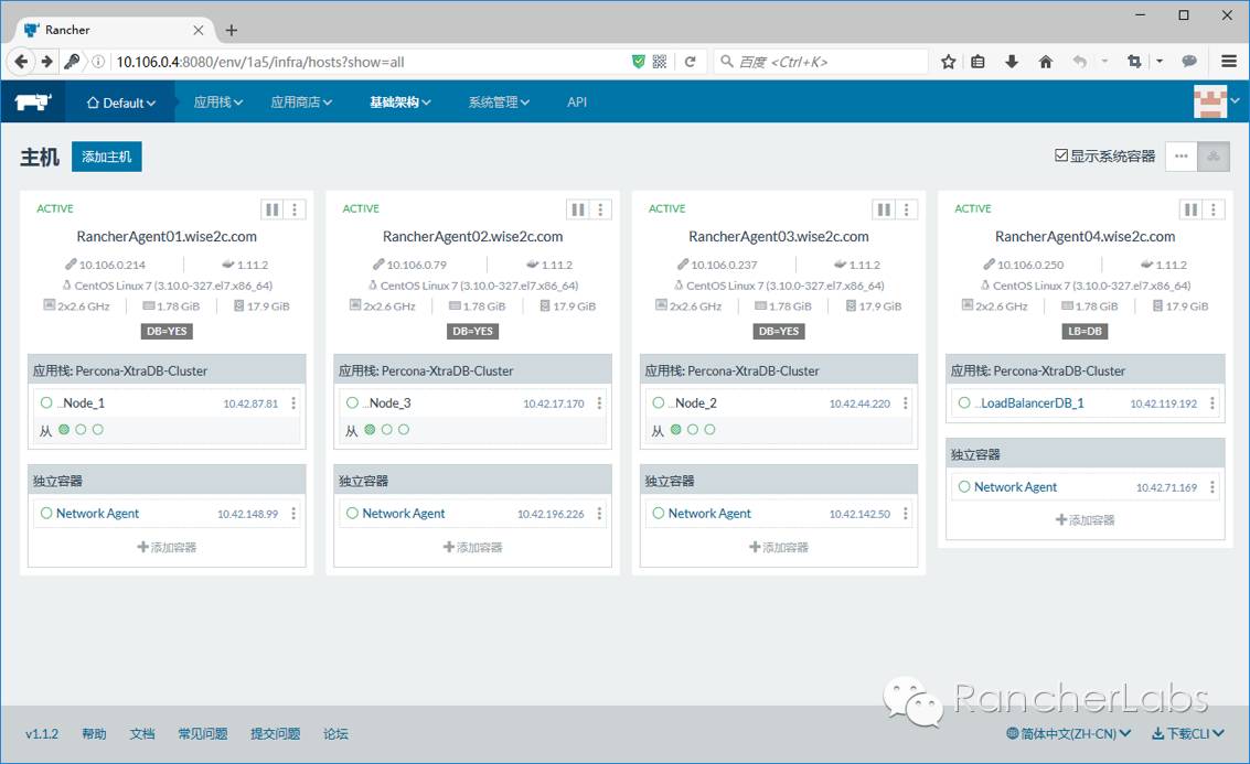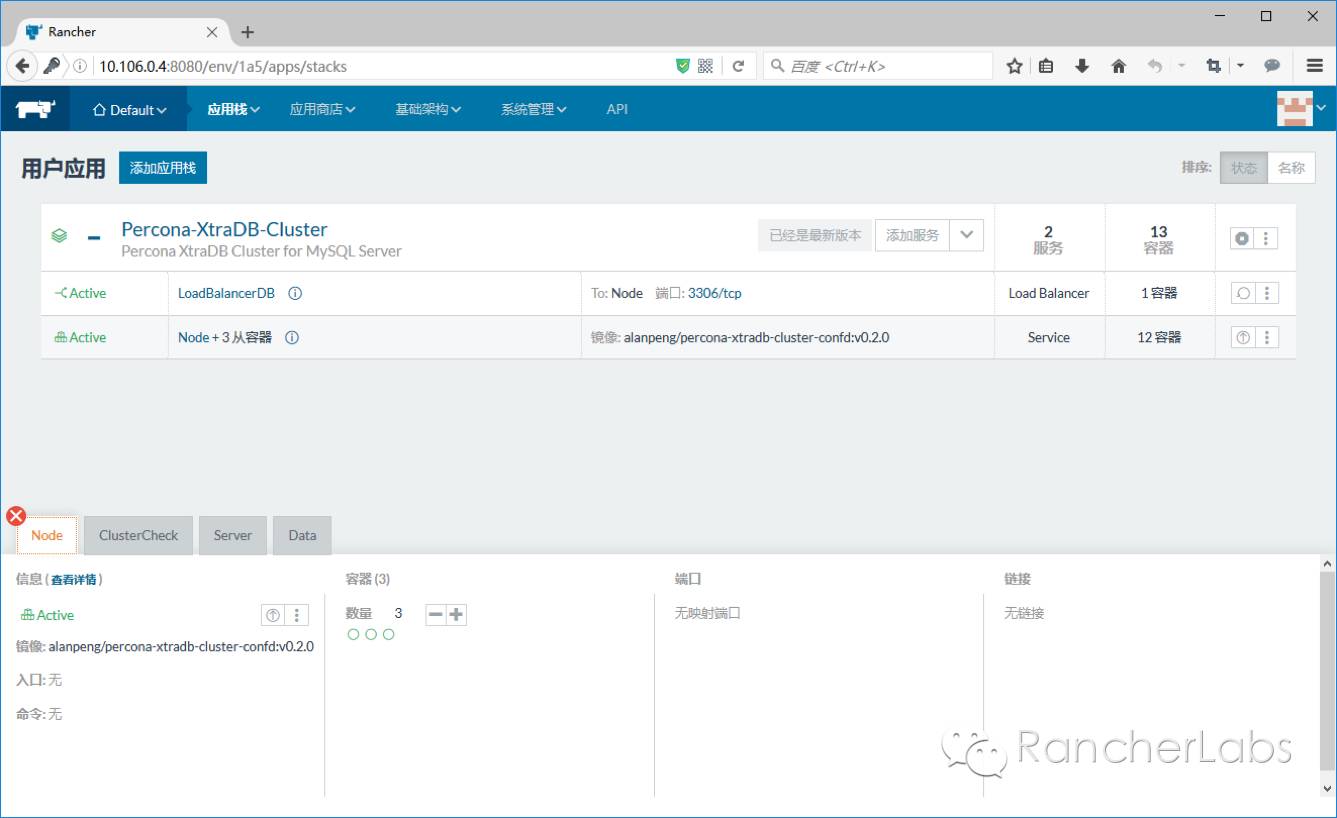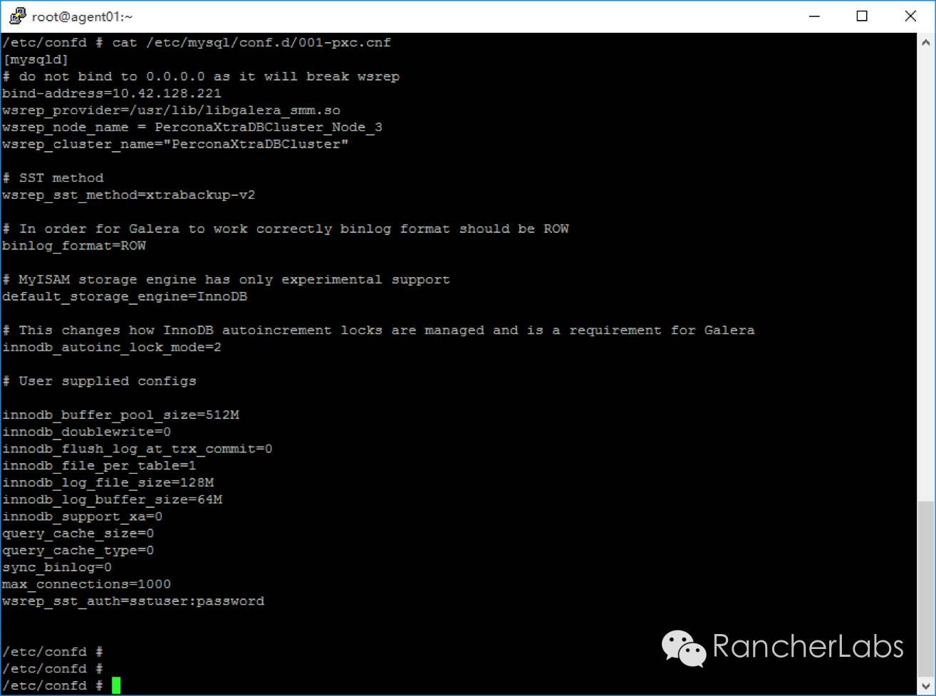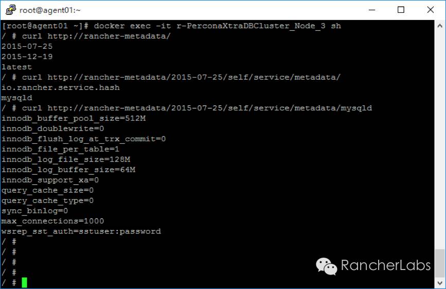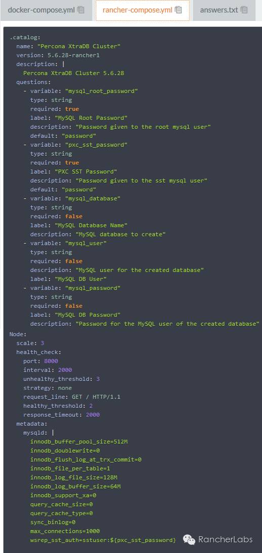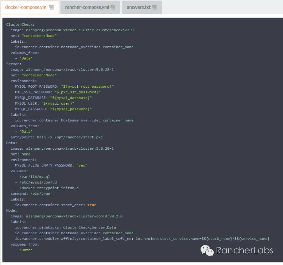 从Percona XtraDB Cluster这个Rancher的Catalog项目,我们可以较为全面的理解confd配置服务是如何与Rancher的元数据服务进行结合的,这样就能实现较为复杂的数据库集群应用完全自动化的实现弹性伸缩功能。