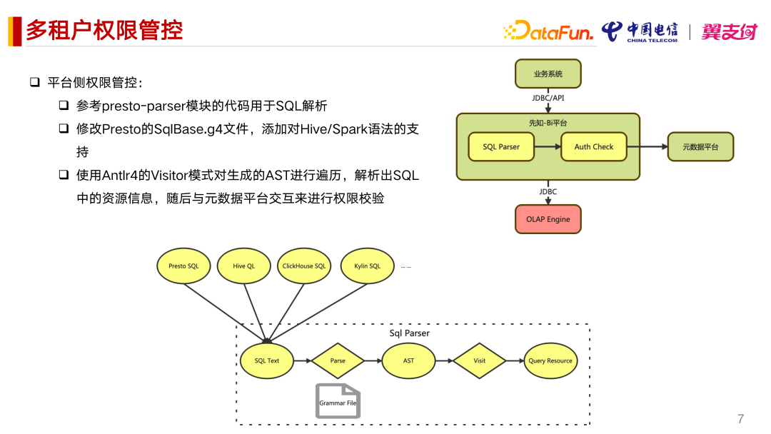 自助 BI 平台中有抽象层,相当于 SQL 的一个 Gateway 做路由层,对用户屏蔽不同语 SQL 的语法差异。因为我们知道不同的引擎,比如 Kylin、ClickHouse,或是一些其它的引擎,会有一些 SQL 语法差异。我们想在这一层能实现 SQL 语法的统一转换,对用户提供统一的 SQL 接口。