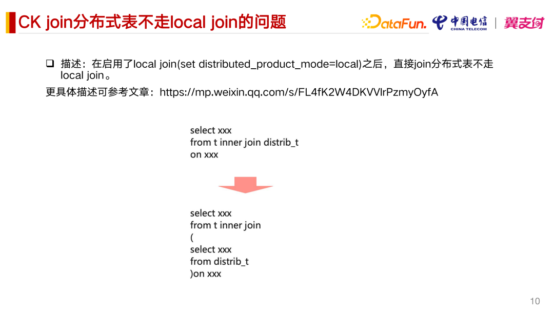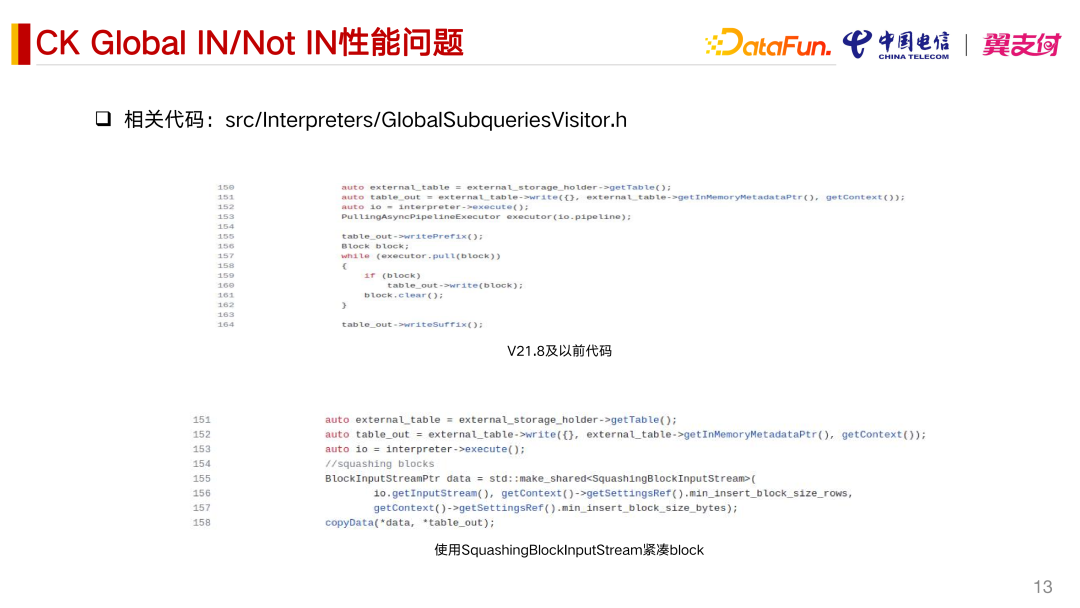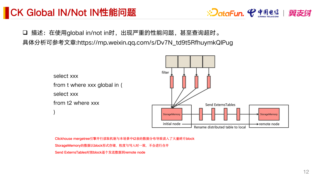 我们在实际生产中碰到一个性能比较严重的问题,就是 Global In 和 Not In 的问题。我们在查询场景中,Global In 里边会带子查询,这个子查询会带有一个 Where 条件。我们发现在生产上它的性能非常慢,甚至出现超时的情况。主要是三个问题导致了这个性能问题。