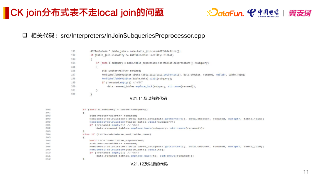 我们目前生产在用的 Clickhouse 版本为 21.8,而在 V21.11 及以前的代码考虑到了子查询的场景,但是它没有考虑到直接写表名的这种情况。不过这个问题在 V21.12 做了修复。