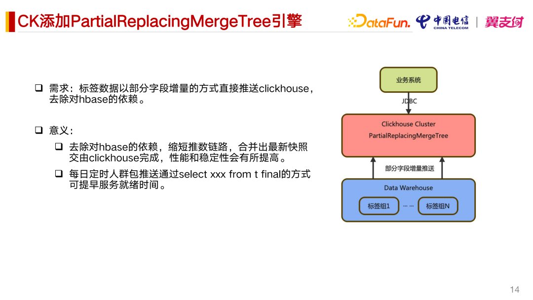 在精准营销场景中,标签表有 400 多个字段用来存储用户标签,数据量在几亿行。根据用户标签的任意维度,圈选人群。现有的一个架构由数仓层会有几十个标签组的生产任务,会把这些任务推送到 Hbase 里面。如上图所示的为全新的架构,仅加工增量数据,即变动的标签。推送时间在一个小时以内。