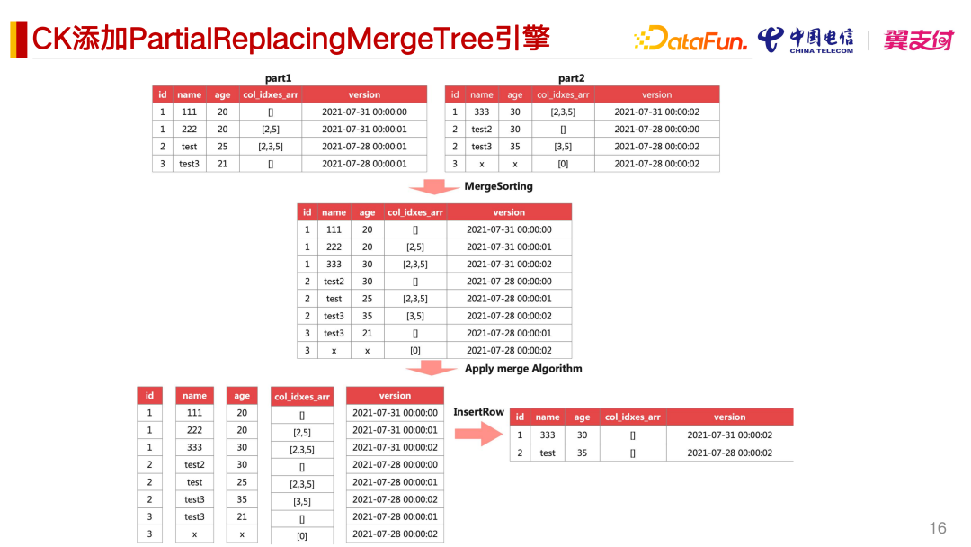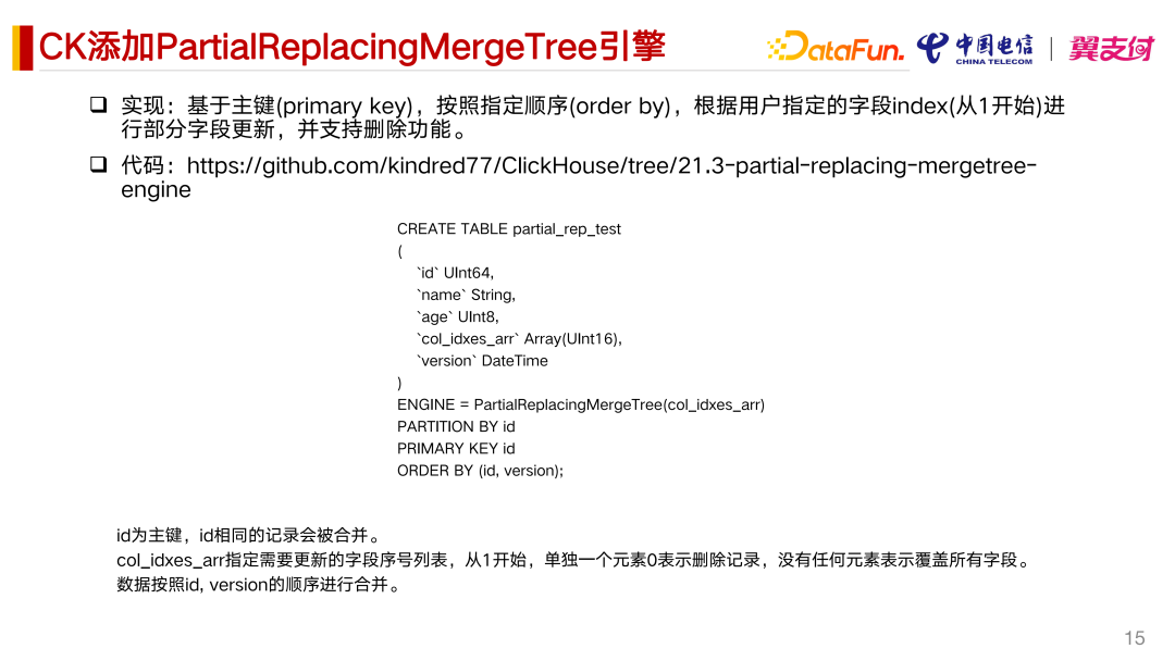 这个方案还是一个不可持续的方案。我们决定还是用比较简单直接的办法,扩展一个引擎,基于主键,按照指定的顺序,根据用户指定的字段的 Index 进行部分字段的更新。按照指定的顺序进行覆盖更新,而且可以支持只覆盖某些字段,并且支持删除功能。
