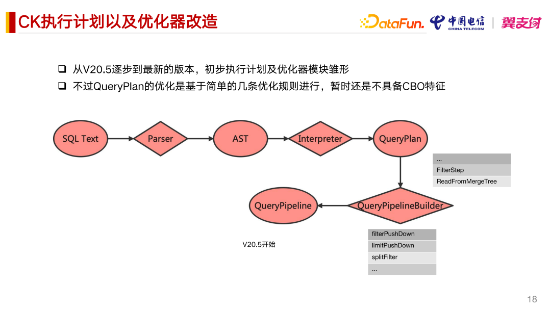 从 V20.5 逐步到最新的版本,初步有了执行计划及优化器模块雏形,不过 QueryPlan的优化是基于简单的几条优化规则进行,暂时还是不具备 CBO 特征