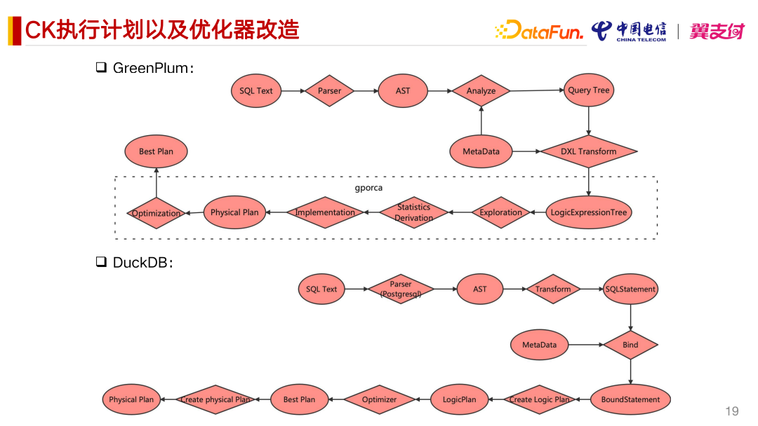 是一个比较经典的 MPP 数据库。SQL 语法进入到解析器,然后再解析成 AST。在 Analyze 阶段,会结合元数据,把抽象语法转成 Query Tree,把这个 Query 转化为逻辑树的概念,其实也就相当于是一个逻辑执行计划。然后做操作的等价变换,比如 Join 表的顺序交换,可以做等价的变换。接下来就是产生统计信息的阶段。再接下来就进入到 App Implementation 阶段,就是实现阶段,会把它的逻辑执行计划转成物理执行计划,再接下来才去应用真正的优化算法去基于这个物理执行计划优化,然后拿到最终的最优的执行计划。