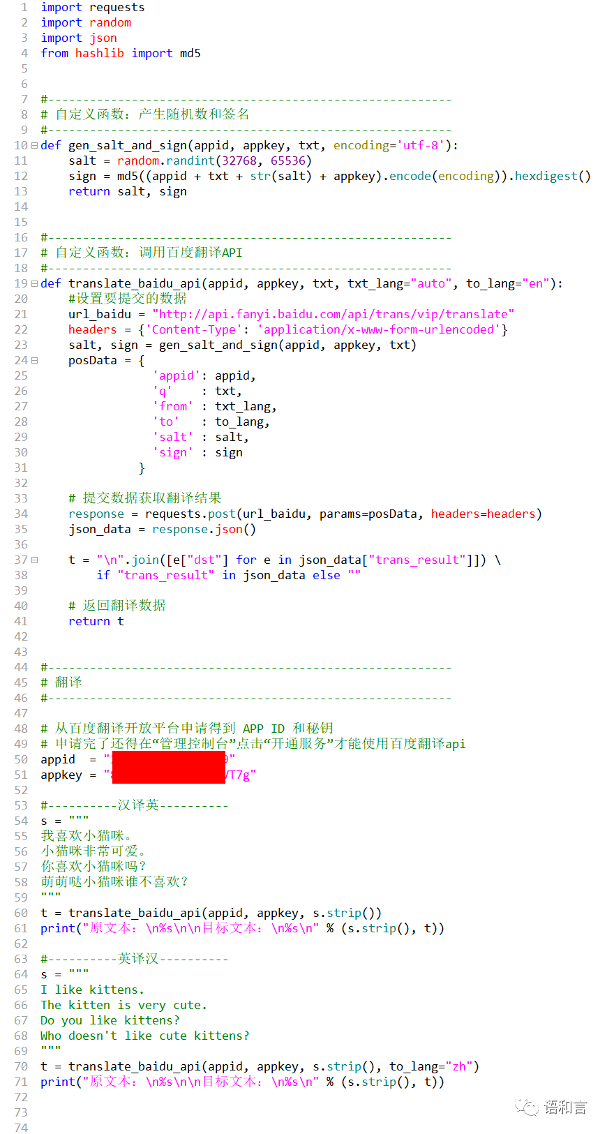 开通服务之后,我们拿着 APP ID 和秘钥就可以写程序代码调用百度翻译API了。调用方法可以参考通用翻译API的开发文档: