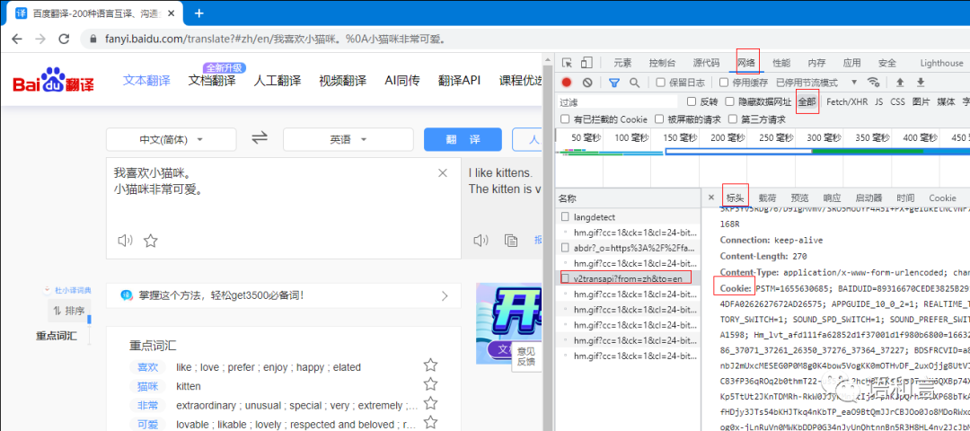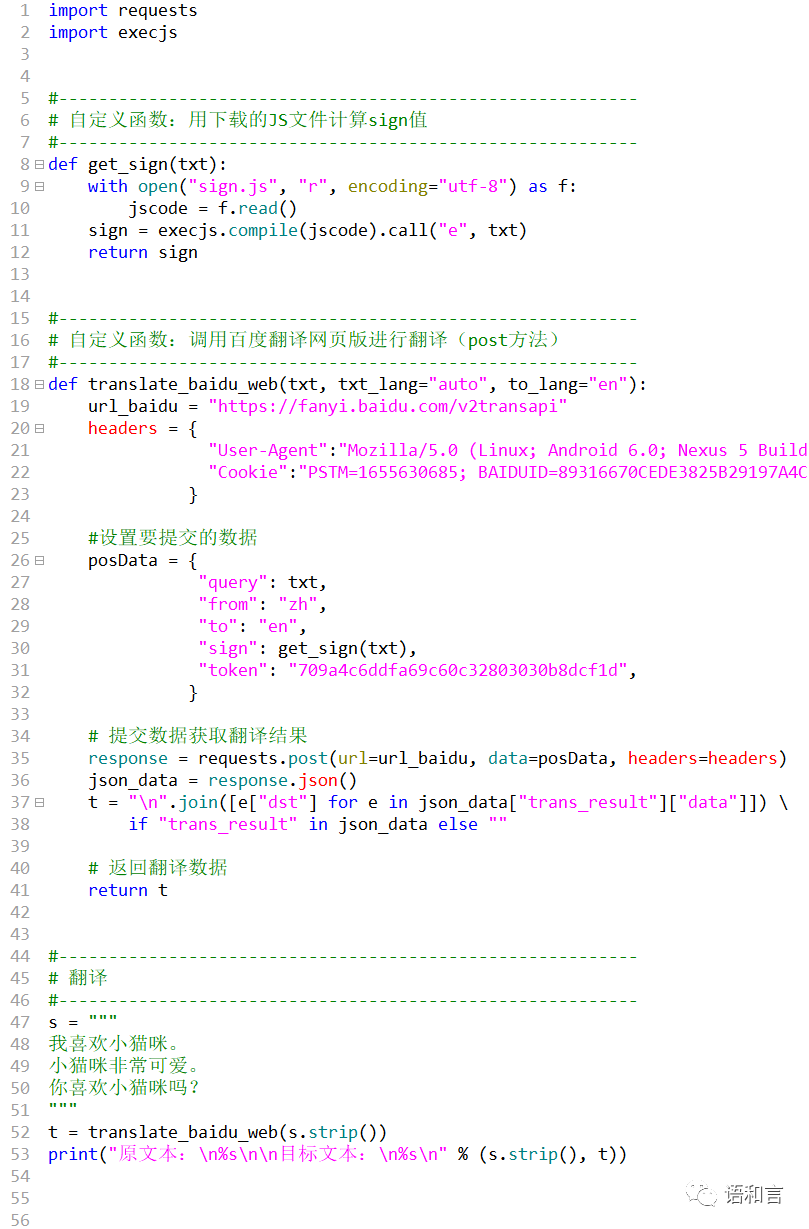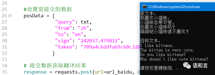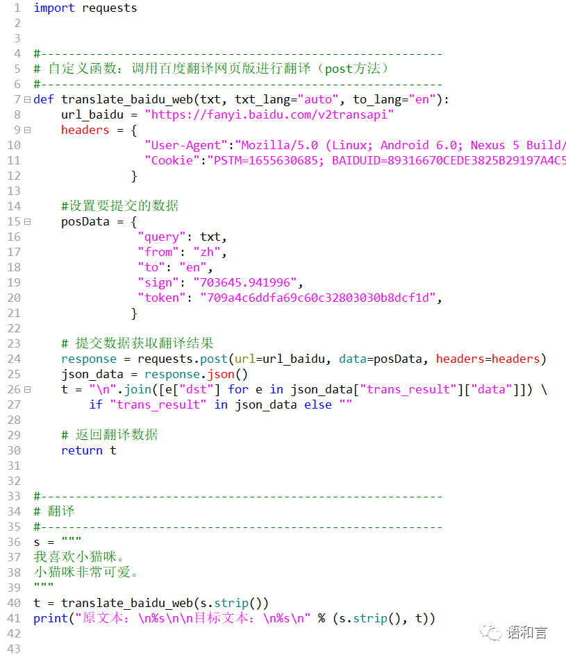 posData = {"query": txt, # 要翻译的原文本"from": "zh", # 原文本的语言代码,这里是汉语"to": "en", # 目标语代码,这里是英语"sign": "***.***","token": "***",}