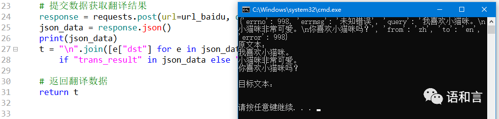 赶紧在源代码的第25行和第26行中间插入一个print语句,看看调用百度api的返回值是啥。再次运行程序之后,得到如下结果: