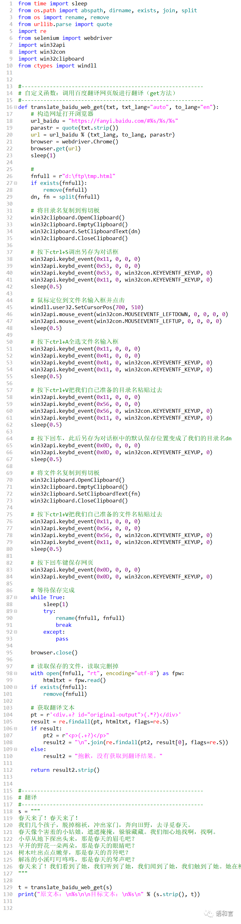 通过上面的视频,我们看到,程序运行之后,自动打开了百度翻译的网页,自动输入翻译内容并点击翻译按钮,然后模拟键盘操作将翻译页面另存为d:\ftp\tmp,html,然后程序自动从中提取翻译结果。