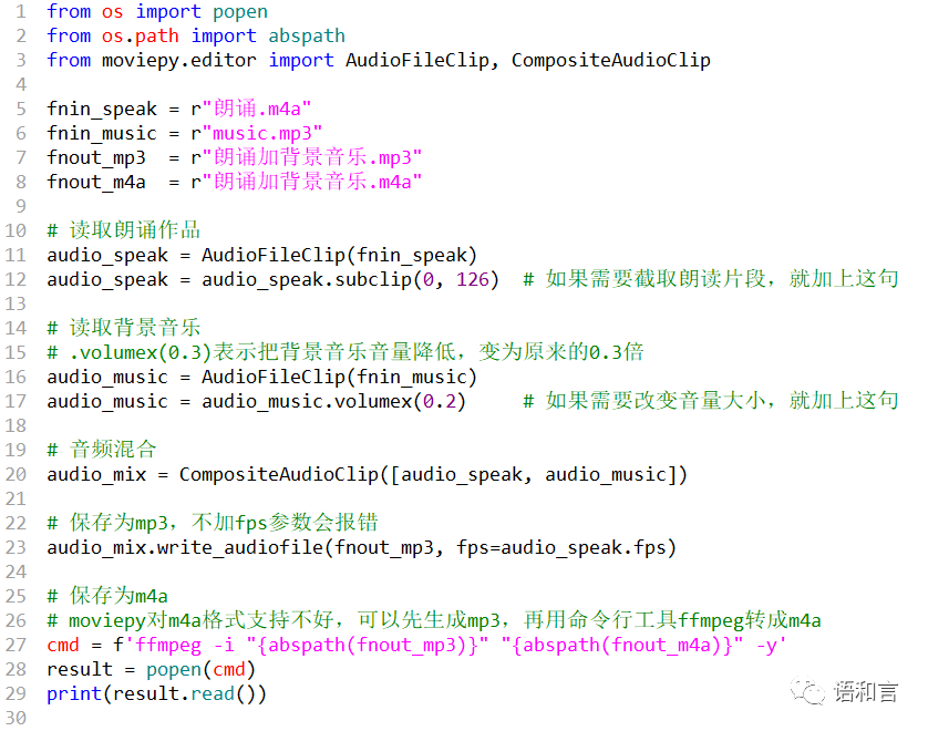 今日分享一个用moviepy给朗诵作品配背景音乐的Python程序。朗诵作品是手机录的m4a文件,音乐文件是mp3文件。