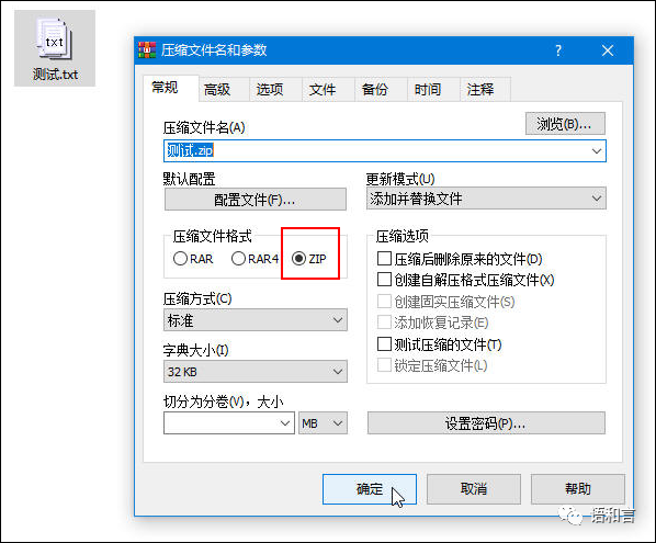 压缩文件格式选择“ZIP”,然后点击“确定”按钮。
