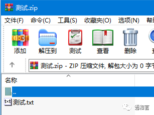 此后就会得到 测试.zip 。我们双击这个文件,即可用 WinRAR 打开该压缩文件,看到这个压缩包是这样子的。