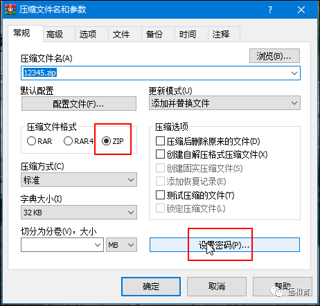 在 12345.txt 的文件图标上点鼠标右键,选择“添加到压缩文件(A)…”),然后压缩文件格式选择“ZIP”,再点击“设置密码(P)…”按钮,如下图所示。