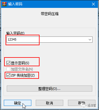接下来,在弹出来的“输入密码”窗口中,输入密码12345,勾选“显示密码”就能看到输入的密码,我们还需要勾选“ZIP传统加密(z)”选项,如下图所示。