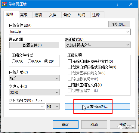 (1)设置密码时采取默认选项,也就是不勾选“ZIP传统加密(z)”,即可采用默认的AES算法对文件进行加密;