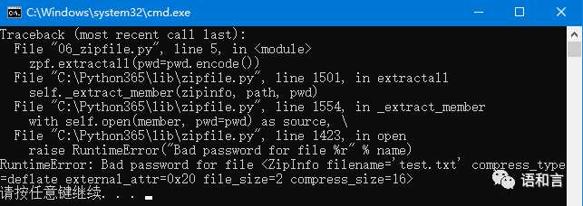 对于解压缩密码包含特殊字符的 test.zip,zipfile标准库无能为力,下面的程序居然不行。