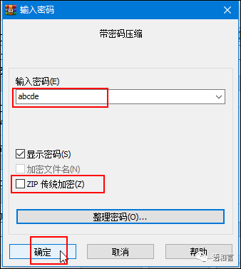 (2)设置密码时勾选“ZIP传统加密(z)”,即可采用Zip 2.0传统加密(CRC32)算法对文件进行加密。