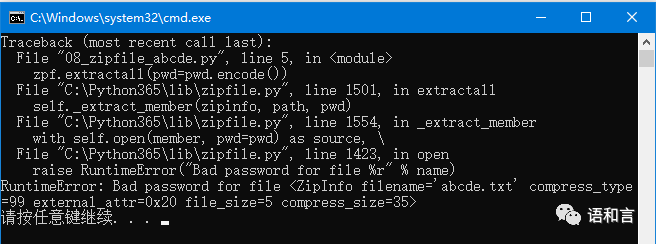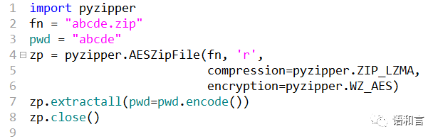3、Python标准库中的zipfile模块只支持Zip 2.0传统加密(CRC32)的zip文件,不能解密AES加密的Zip文件;