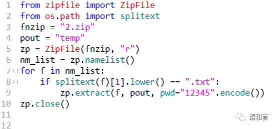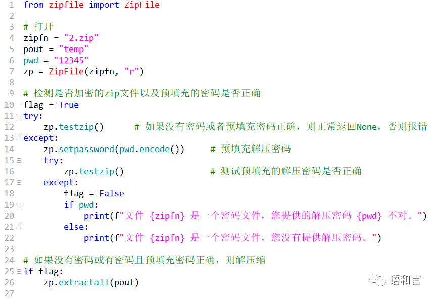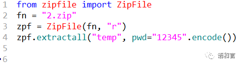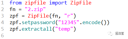 也有一些程序不是怎么处理密码的,它们不是为 zp 对象的 extractall 方法和 extract 方法增加一个 pwd 参数,而是在打开 zip 文件之后先用 zp 对象的 setpassword 方法预填充一下密码,后面解压缩的时候就无需带 pwd 参数了。