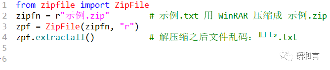 有一个文件名叫“示例.txt”,用 WinRAR 压缩成 “示例.zip”,再用下面的代码解压缩就会得到一个乱码文件,文件名变成了“╩╛└²”。