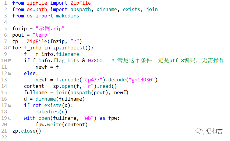 造成乱码的原因是 zipfile 标准库只认 utf-8 编码 和 cp437 编码,只要不确定是 utf-8 编码,它就一律认为是 cp437编码,相当一部分包含汉子的文件名在加压缩时被认成了 cp437 编码,所以发生了乱码现象。解决办法是逐个获取zip压缩文件的文件名,然后根据一些信息在确定该文件的编码不是 utf-8 之后直接用指定编码来解压缩该文件即可。在咱们中文Windows操作系统中,我们指定用 gb18030 编码就行。