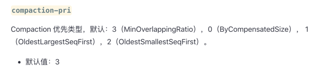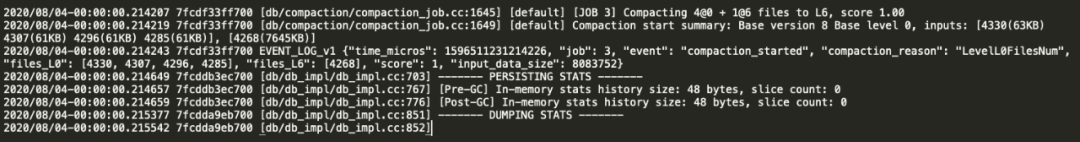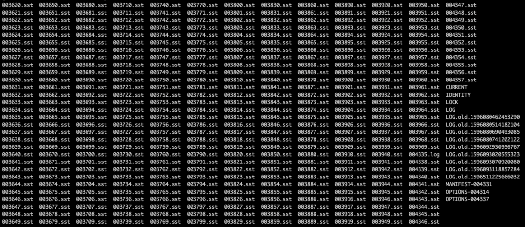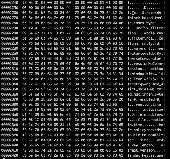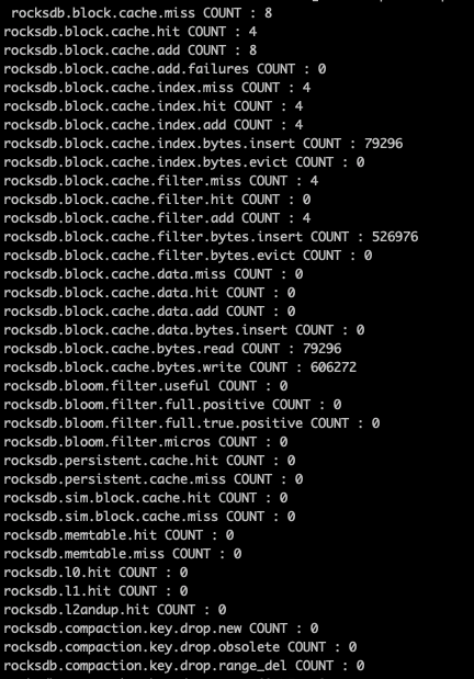 [CFOptions "raft"]sample_for_compression=0compaction_pri=ByCompensatedSizemerge_operator=nullptrcompaction_filter_factory=nullptrmemtable_factory=DoublySkipListFactorymemtable_insert_with_hint_prefix_extractor=nullptrcomparator=leveldb.BytewiseComparatortarget_file_size_base=8388608max_sequential_skip_in_iterations=8compaction_style=kCompactionStyleLevelmax_bytes_for_level_base=134217728bloom_locality=0write_buffer_size=134217728......[TableOptions/BlockBasedTable "raft"]pin_top_level_index_and_filter=trueenable_index_compression=trueread_amp_bytes_per_bit=8589934592format_version=2block_align=falsemetadata_block_size=4096block_size_deviation=10partition_filters=falseblock_size=16384......