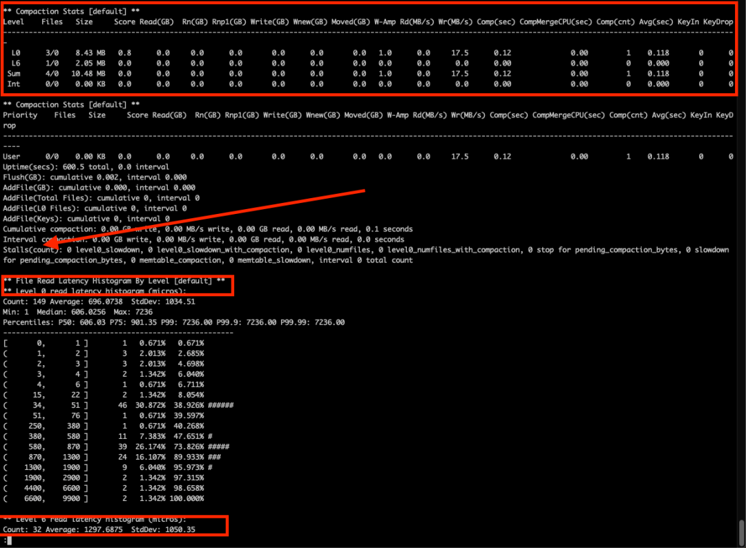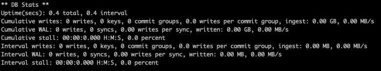 keys - 总的写入 key 的数量 commit groups - 总的 group 提交的数量 writes per commit group - 每个 group 提交包含的写入次数 ingest - 直接 ingest 到 DB 的数量 MB/s - 写入的速度 WAL: writes - 总的写入次数 syncs - 强制 sync 的次数 writes - 每次 sync 有多少次写入 written - 总的写入数据量 MB/s - 写入的速度 stall: H:M:S - 总的 stall 的时间 percent - stall 的时间在总时间的比例