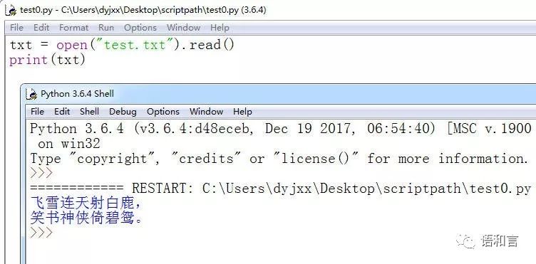 现在用两种方式运行test0.py。第一种运行方式是在IDLE中加载并运行test0.py;第二种方式是通过命令行来运行test0.py。