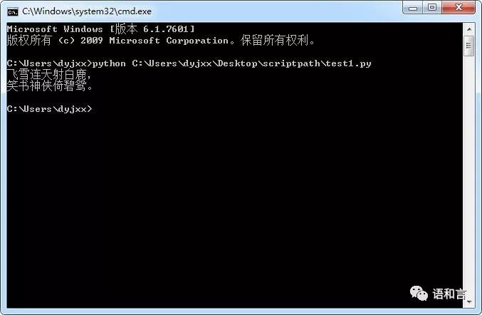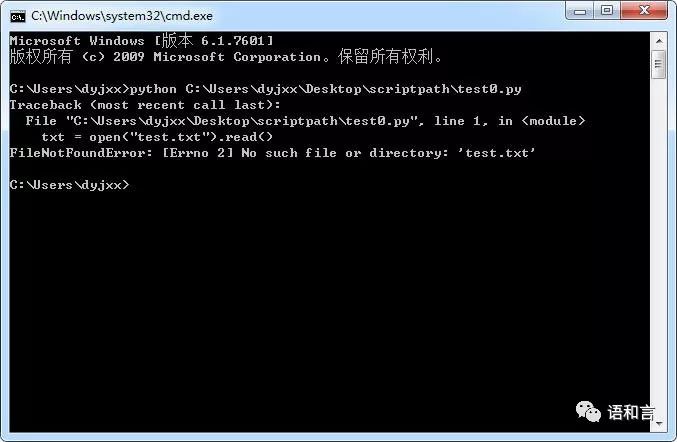 怎么样才能让它在命令行下运行不出错呢?这就需要用到当前目录。我们只需要将test.txt所在的目录 C:\Users\dyjxx\Desktop\scriptpath 设置成当前目录即可解决问题。