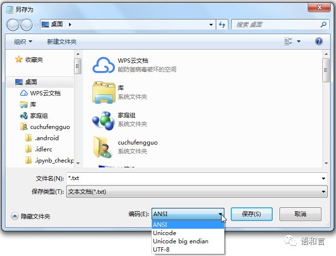 打开Windows的记事本,使用另存为菜单,我们发现“编码”的下拉列表框里有四种选项: