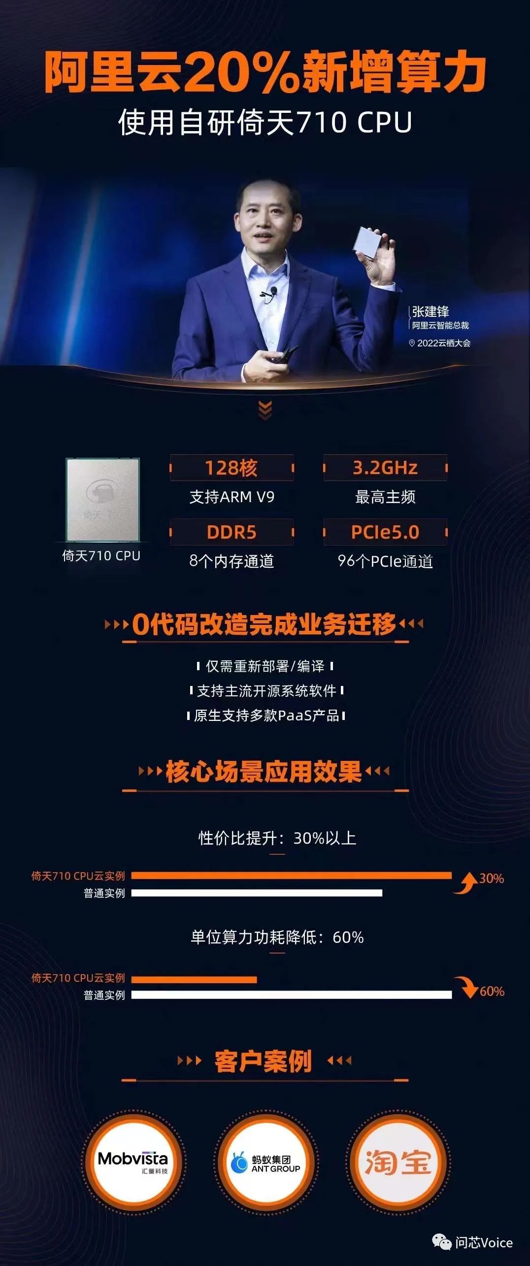 2021年云栖大会,阿里平头哥发布首颗自研CPU芯片倚天710。经过一年业务验证,2022云栖大会上阿里云宣布倚天710已大规模部署并提供云上服务,这是中国首个云上大规模应用的自研CPU。
