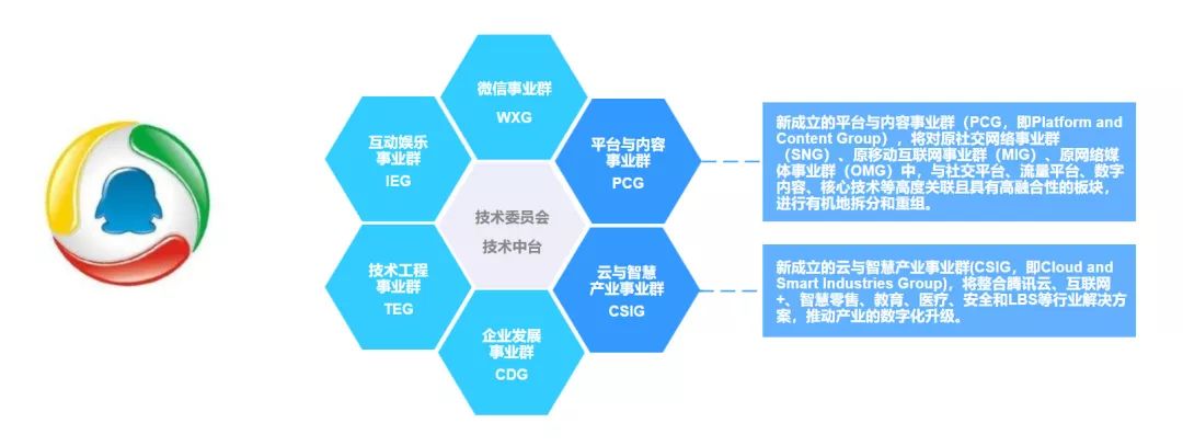 在原有 7 大事业群的基础上进行重组整合,新成立了云与智慧产业事业群(CSIG)、平台与内容事业群(PCG),调整为新的 6 大事业群。而 6 大事业群紧紧围绕的,正是技术委员会充当“技术中台”角色。
