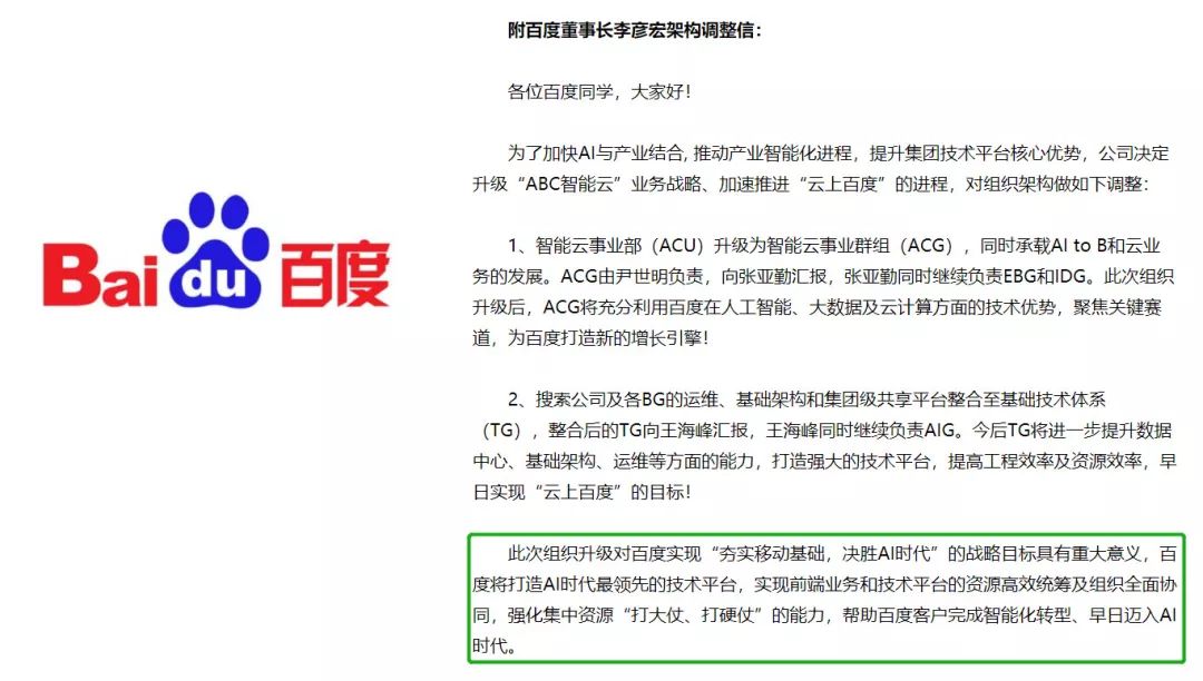 同年 12 月 18 日,百度集团进行了一次大的架构调整,由百度创始人、董事长李彦宏发信宣布:“百度将打造 AI 时代最领先的技术平台,实现前端业务和技术平台的资源高效统筹及组织全面协同。”