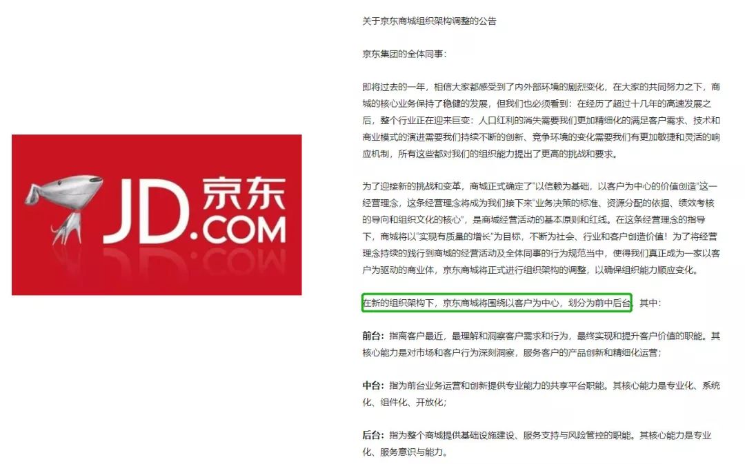 公告内容称:“在新的组织架构下,京东商城将围绕以客户为中心,划分为前中后台。中台为前台业务运营和创新提供专业能力的共享平台职能。”