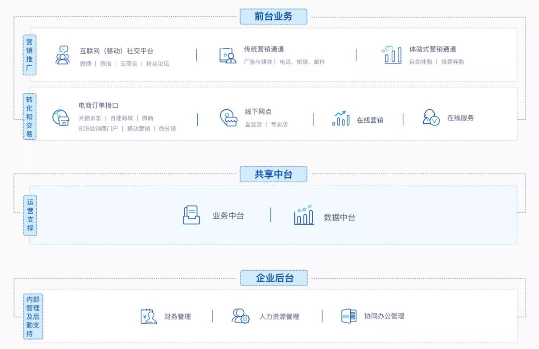 前台作为一线业务,更敏捷更快速适应市场;中台集合整个集团的数字、运营、产品、技术能力,对各业务前台形成强力支撑。
