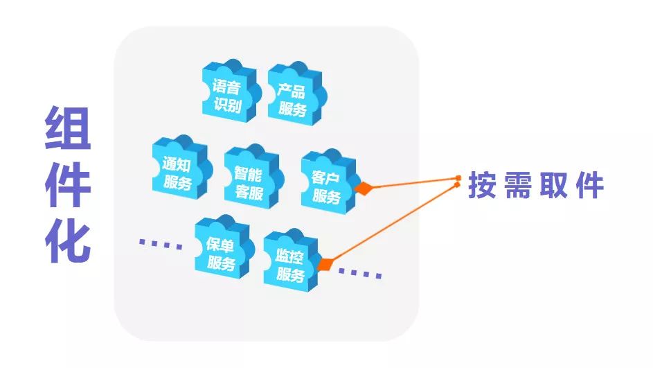 通过抽象出的组件化服务提供,前台业务端可以以组合挑选的方式“按需取件”,减少重复建设得以实现。