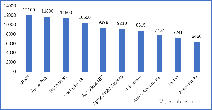 官方的NFT分类并非指类似Opensea的交易平台,而是NFT的创作方,因此目前官方统计的NFT项目数量在各细分赛道中最多,有60个。NFT项目种类繁多,且更多依靠宣传运营,该赛道项目粉丝数大多集中在1000-3000范围内,即使是“头部”项目NFMS也仅有1.2万粉丝,与当前市场主流项目BAYC、Azuki等相差甚远。但经过梳理后我们发现,该类项目名称中更多加入了“Aptos”字样,如Aptos Punk、Aptos Alpha Alpacas、Aptos Ape Society等,可以期待该类项目或将受益于Aptos主网正式上线,以获得关注度的快速提升。