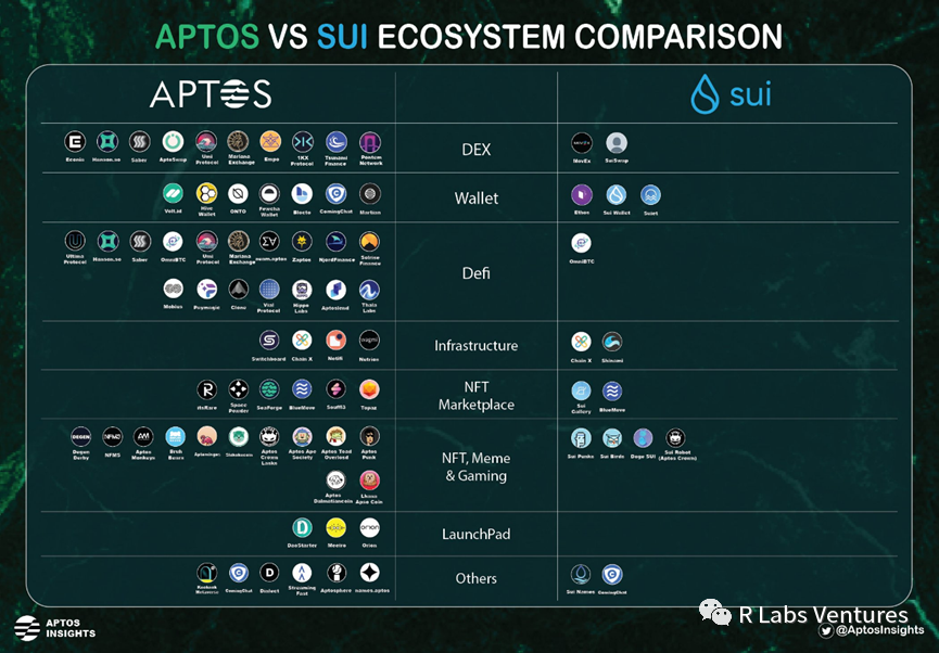 Sui和Aptos作为Diem项目一脉相承的师兄弟项目,同样获得了如a16z、FTX Ventures、Binance Labs和Coinbase Ventures等众多知名资本的青睐。但相较于Aptos,Sui目前的发展速度和生态建设相对落后。而另一方面对于开发者而言,Sui 生态中也还有很多机会。