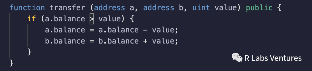 我们以Solidity为例,下面的一段Solidity代码实现了转账的功能。这段代码实现了地址A对地址B的转账,实现的方式是对A和B各自对应账户的余额数字进行加减。