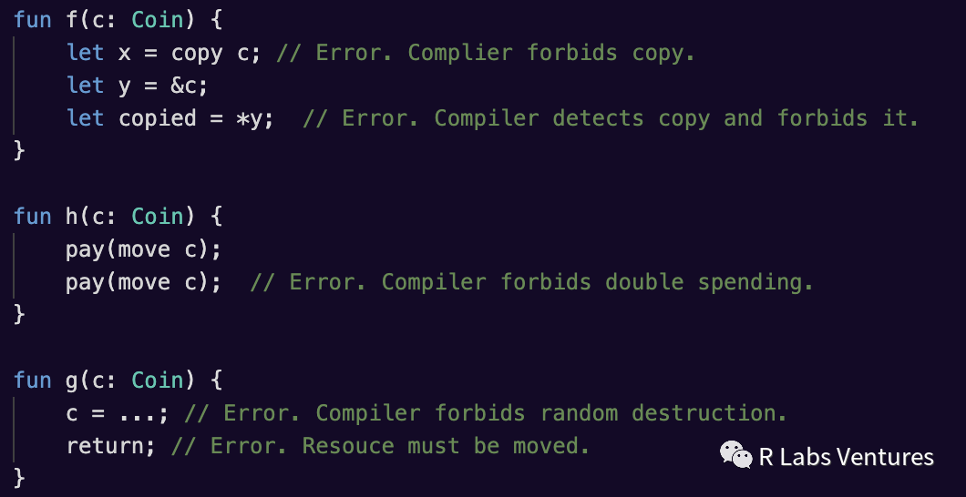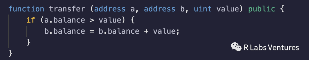 对于资产来说,最重要的属性之一是稀缺性。在物理世界中,实物资产自然而然具有稀缺性。例如,当人们使用贵金属进行交易时,贵金属从买方转移到卖方,发生了物理上的转移。但是在传统的计算机虚拟世界里,资产仅仅被用数字进行表示,资产的增减就对应于数字的加减,所有的合理性都依赖于程序员编写代码时的谨慎。然而随着系统复杂度的提升,这种谨慎是难以保证的。物理世界中资产的稀缺性,并不能通过计算机中的数值来简单的模拟,资产的安全性也就随之大打折扣。接下来,R Labs将通过一段简单易懂的代码,来展示Move与其他区块链编程语言在抽象化资产时的不同处理方式。