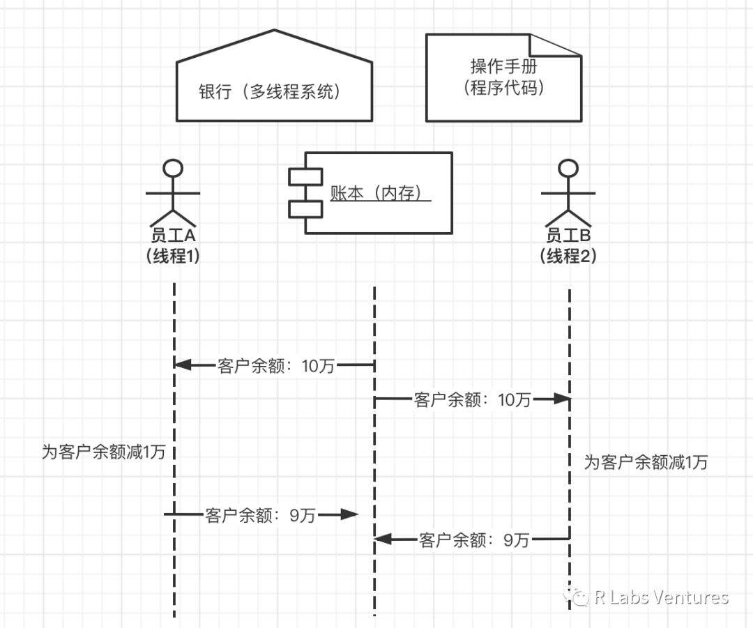 在一种可能的错误场景中,两位银行员工同时去读取银行账本,读到客户的账户余额均为10万元。两位员工各自按照工作手册,为客户进行支付操作,各自将客户余额在10万元的基础上减去1万元,两位员工得到的结果都是“客户余额还剩9万元”。之后,两位员工将各自得到的支付结果(余额9万元)写回了银行账本。在这个例子里,客户明明花掉了2万元,但是因为银行的工作流程中使用了多线程(两名员工同时处理),却没有做好同步控制,导致最终在账本上记下了一个错误的数据。