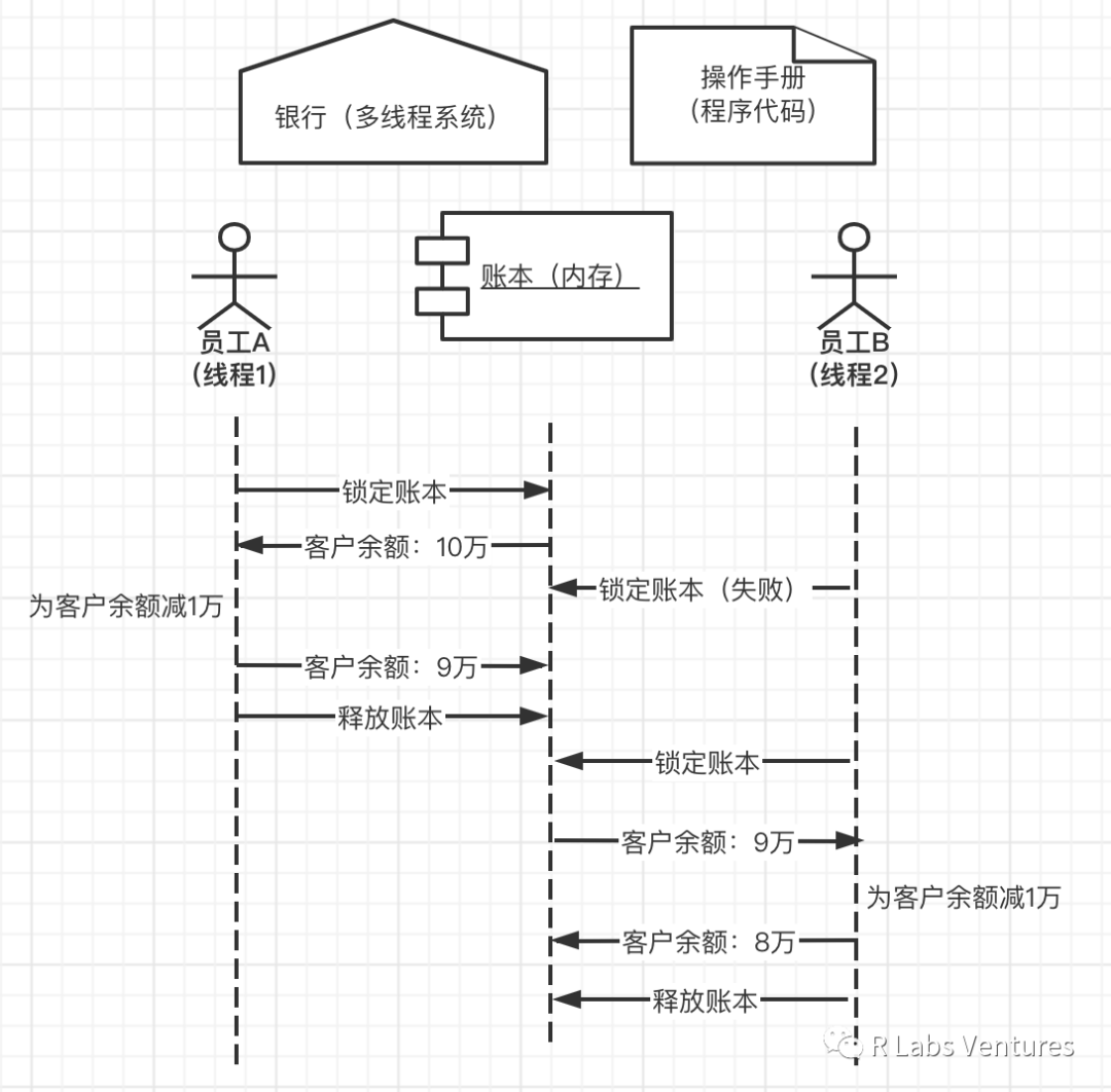 在一个银行系统中,银行同时收到了客户的两笔支付请求,分别需要支付1万元,总共2万元。为了提高处理速度,银行让两位员工同时来处理,每一个员工负责处理一笔支付请求。在这里,两个员工可以类比于计算机系统中的两个线程。银行员工必须按照银行的工作手册规定的流程来服务客户,工作手册可以类比于计算机程序代码。为了处理客户的支付请求,银行员工需要查询唯一一本银行账本,银行账本可类比于计算机的内存。