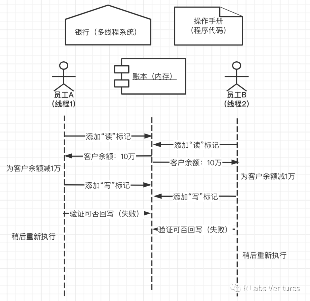 要理解Block-STM,需要先理解多线程系统的并发控制问题,以及STM的解决思路。接下来,R Labs以一个简单的例子来进行解释。