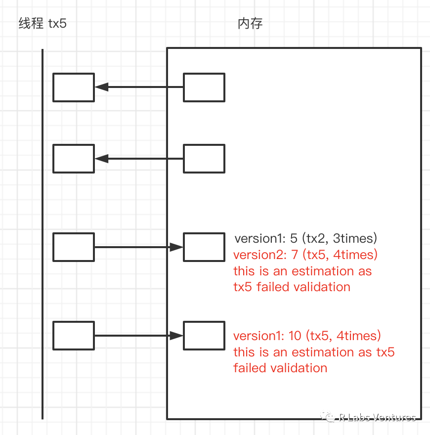 Block-STM使用一个多版本的数据结构来避免写操作之间的冲突。所有对相同地址的写操作与其版本被一同存储,包括transaction ID和这个执行写操作的transaction被乐观地重复执行的次数。当有一个transaction读取一个内存地址的时候,它会从多版本数据结构中获取预设顺序中出现在它之前的最早的transaction,以及与其关联的版本信息。