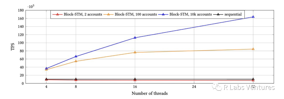Aptos团队对Block-STM引擎进行了测试,结果体现在下图中。蓝色曲线代表使用Block-STM并在测试数据中设置1万个账户的情况(读写冲突较多),黑色线条代表线性执行的情况。在使用32个线程所进行的测试中,使用Block-STM引擎实现的TPS达到了160k,是线性执行引擎的TPS(10k)的16倍。