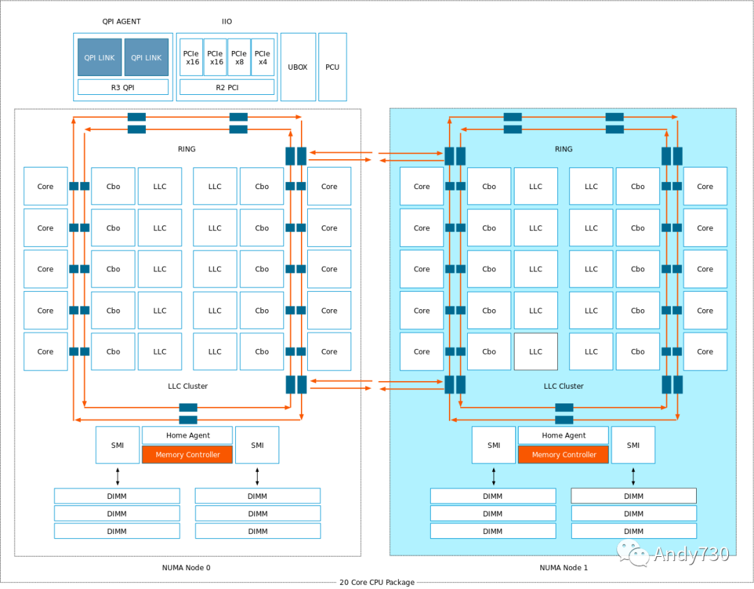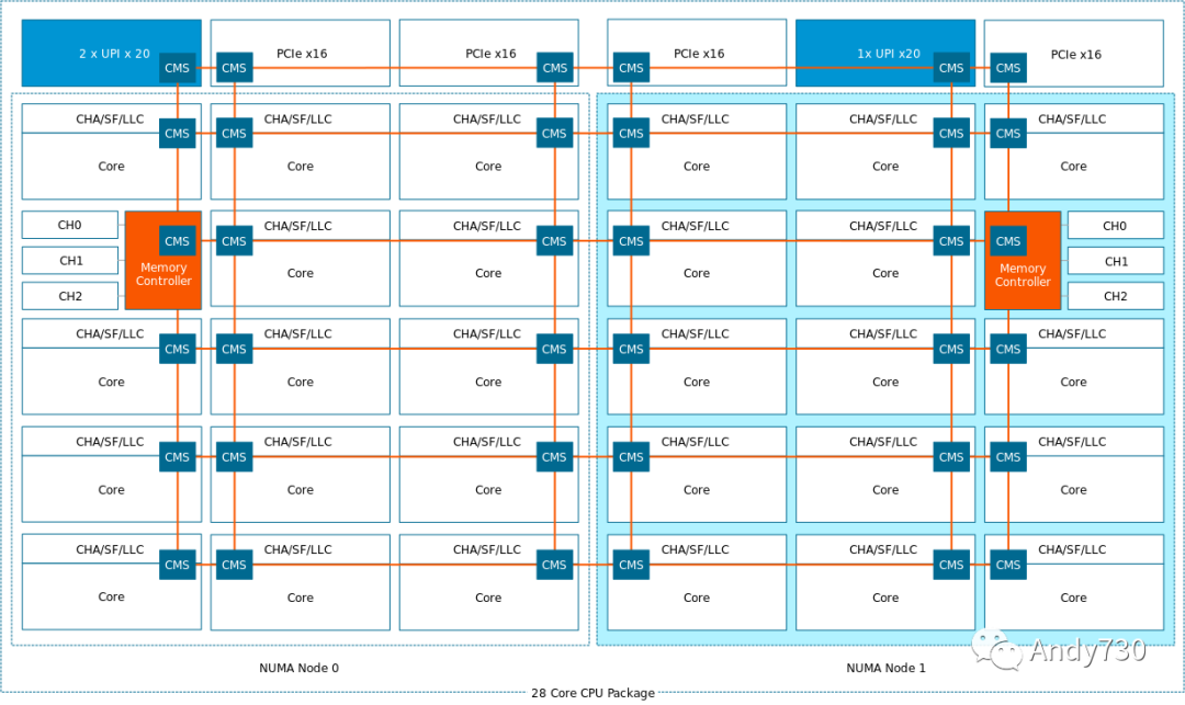 如果我们看一下体系结构图,我们注意到在 NUMA 节点 0 之上,存在一个具有两个 UPI 连接的控制器。在 NUMA 节点 1 之上,控制器位于具有单个 UPI 连接的位置。可能单个 UPI 在网格上会遇到更多的阻塞 I/O 流量,而具有两个连接的 UPI 控制器具有更多方法来更好地管理流。