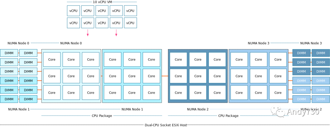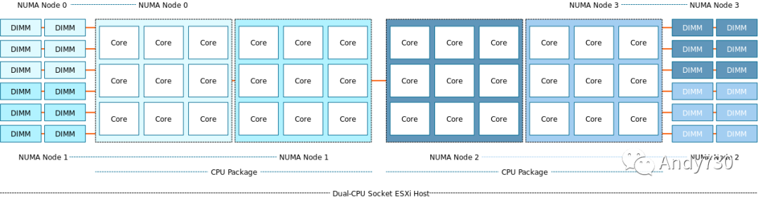 启用 SNC 后,前面显示的双 CPU 插槽 ESXi 主机系统现在是一个四 NUMA 节点系统。